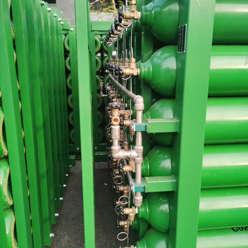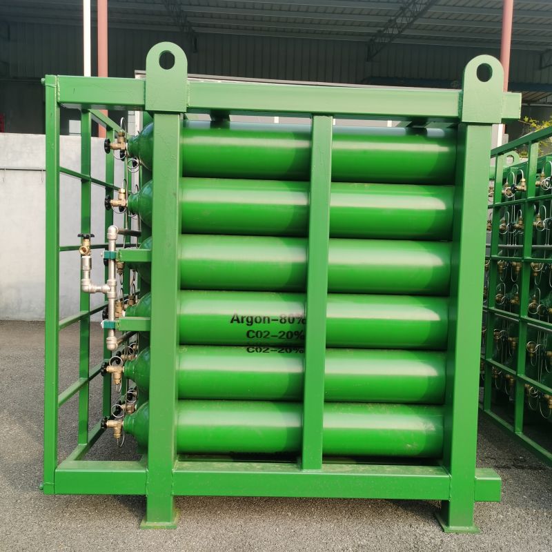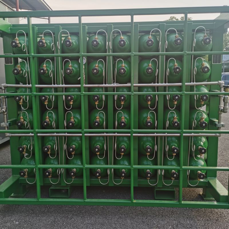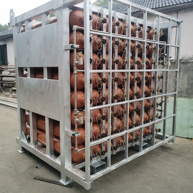 Principiul de proiectare: Mai întâi proiectați un cadru de oțel care poate asambla mai multe sticle, ceea ce este convenabil pentru umplerea generală, transportul general și mișcarea. Apoi umpleți buteliile de gaz și fixați-le și, în cele din urmă, conectați fiecare supapă de sticlă prin bancurile de înaltă presiune. Toate ieșirile buteliilor sunt interconectate între ele pentru a putea fi utilizate ca un întreg simultan.